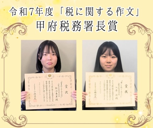 令和7年度「税に関する作文」において、本校3年滝澤さん、2年飯沼さん、1年入倉さんが甲府税務所長賞を受賞しました🎉😀